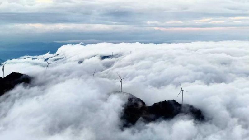 洁白的云雾在冷湿气流的作用下,像瀑布一般从山巅向较低的山谷倾泻而下,气势磅礴。乳白色的云流沿着山体轮廓肆意铺展、翻滚,时而如海浪拍岸,时而似轻纱漫卷,将连绵的青山装点得宛如仙境。奔涌的云海与山脊上林立的风力发电机同框入画,巨大的风机叶轮在云雾中缓缓旋转,仿佛在云端翩翩起舞, 构成了一幅生态和谐秀美的生动画卷。